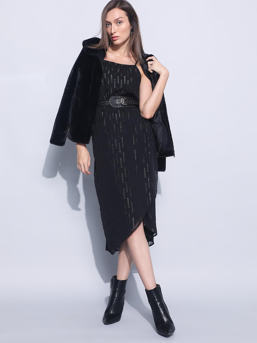 Women’s black midi dress designed with sequin embellished detailing, adjustable straps, gathered at waist, tulip detail at hem, smocking at back, and midi length that falls below knee.