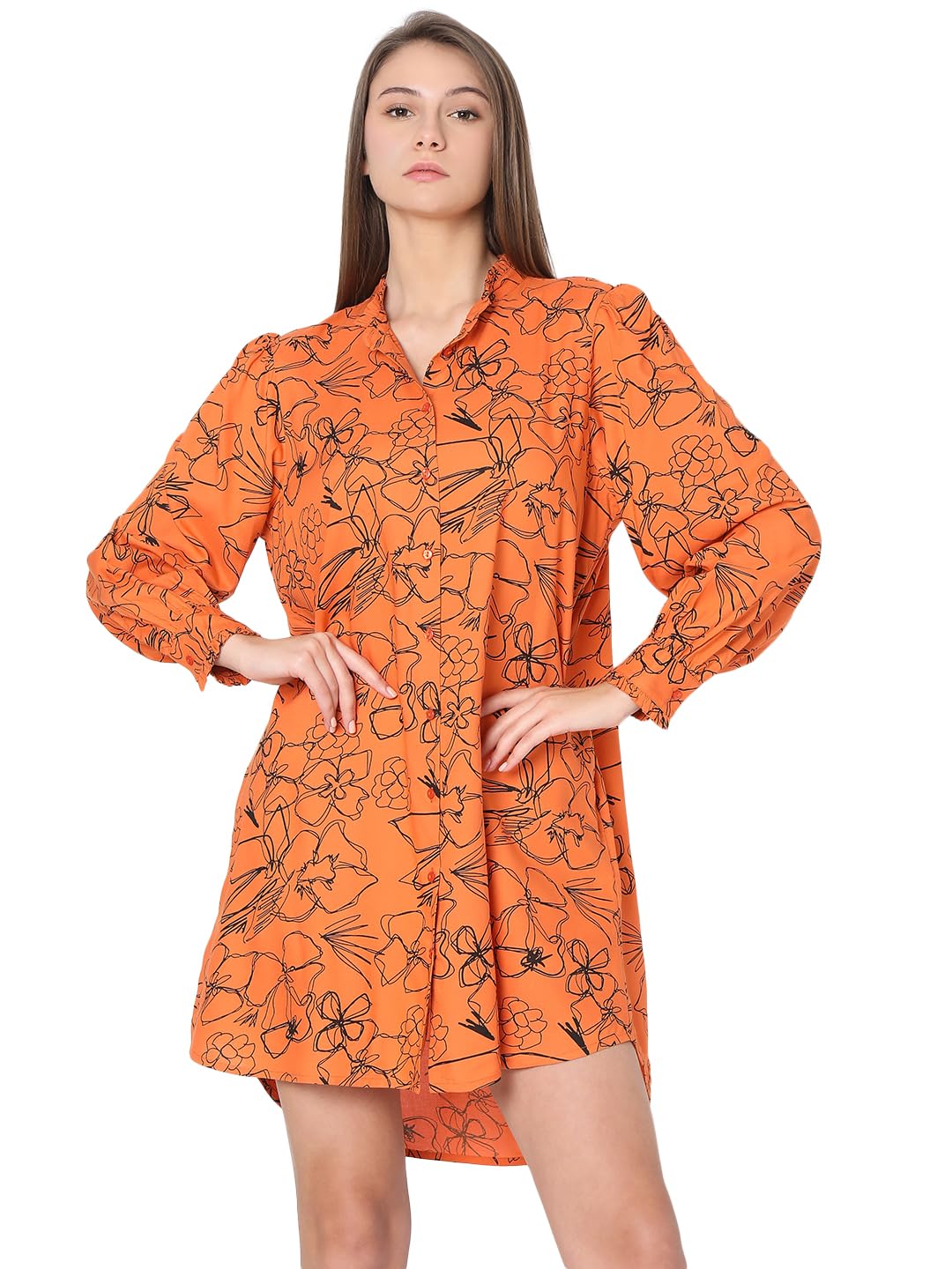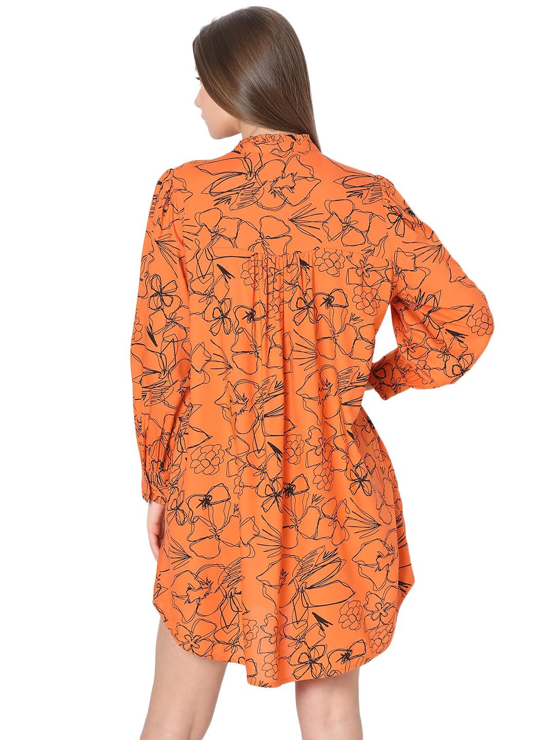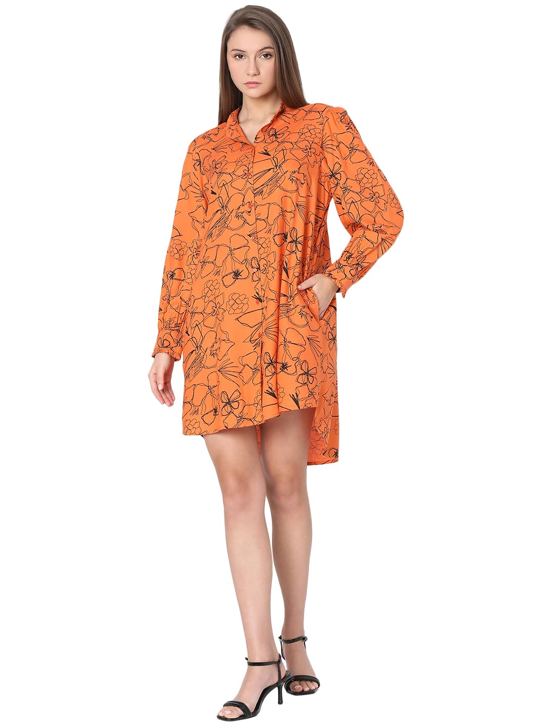 Introducing the perfect summer dress from VERO MODA! This vibrant orange dress features a stunning all over floral print, adding a touch of femininity to your wardrobe. The shirt collar and front placket add a classic touch, while the high low hemline creates a modern and chic look. The loose fitting silhouette allows for comfortable wear and easy movement. Made with high quality materials, this dress is sure to become a staple in your wardrobe. Style this dress with a pair of strappy sandals and a woven bag for a relaxed and effortless daytime look. Dress it up for an evening out by pairing it with heels and statement jewellery. Perfect for any occasion, this versatile dress is a must-have for every fashion-forward individual.