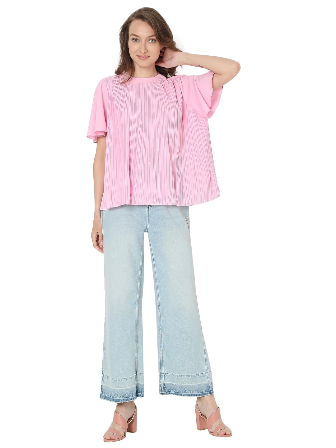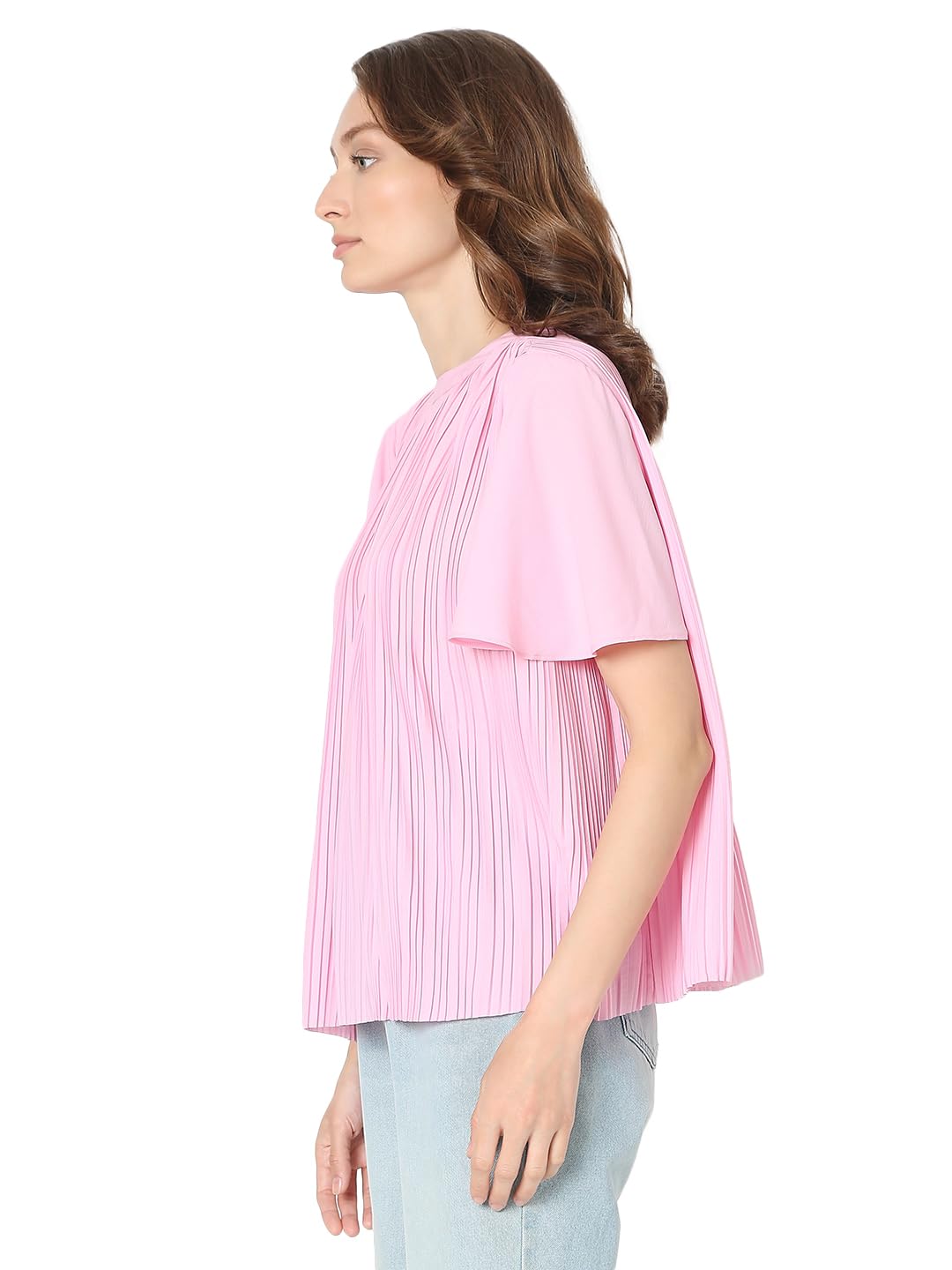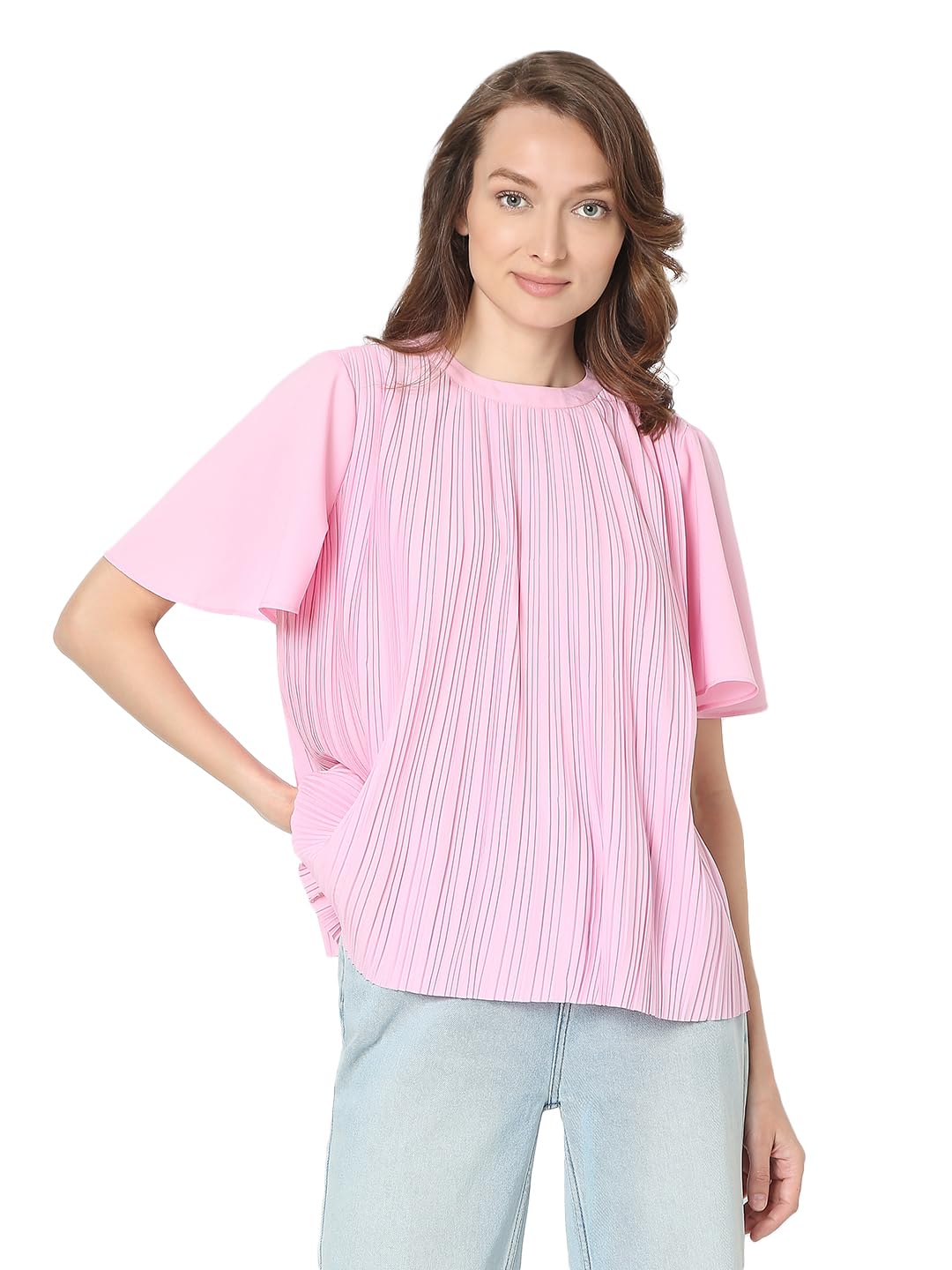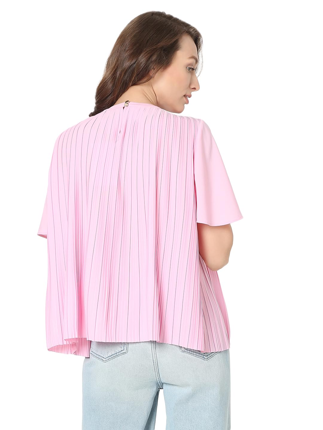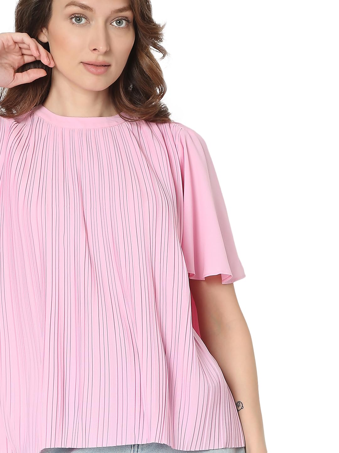 Introducing our latest addition to your wardrobe essentials: a chic Pink Front Textured Loose-fit Top. Crafted with utmost attention to detail, this top effortlessly combines style and comfort. Its round neckline with a subtle band accentuates your neckline while the short flared sleeves add a touch of sophistication. Designed for versatility, the top hem falls slightly below the hips, offering a flattering silhouette that pairs seamlessly with your favourite bottoms.
