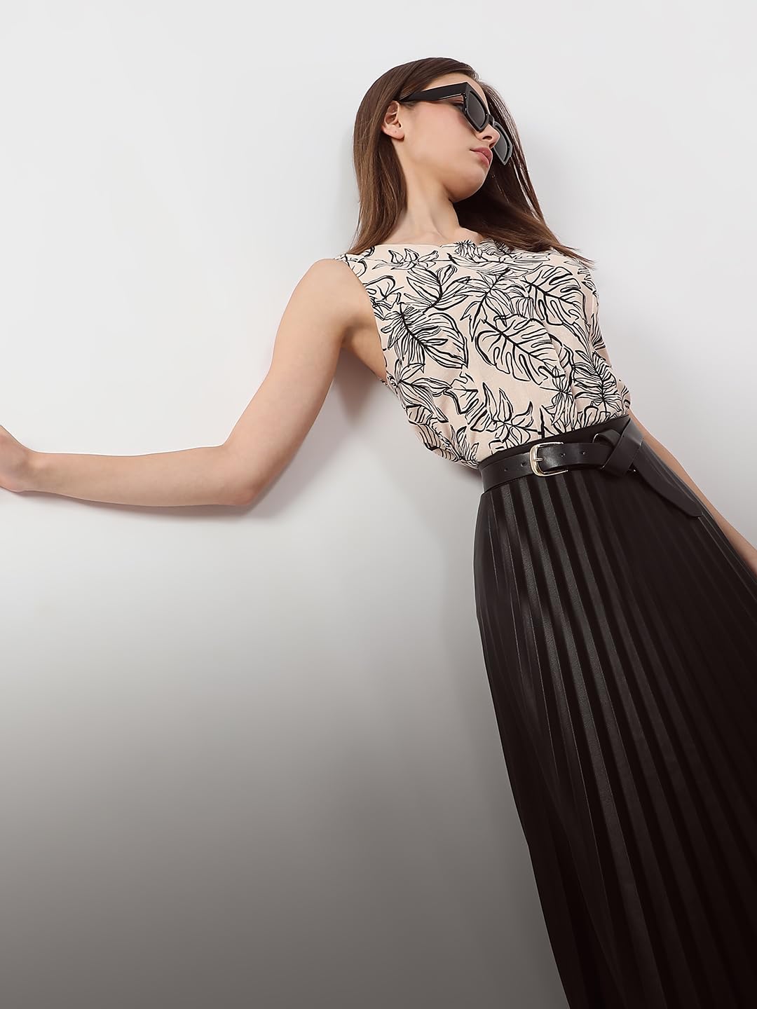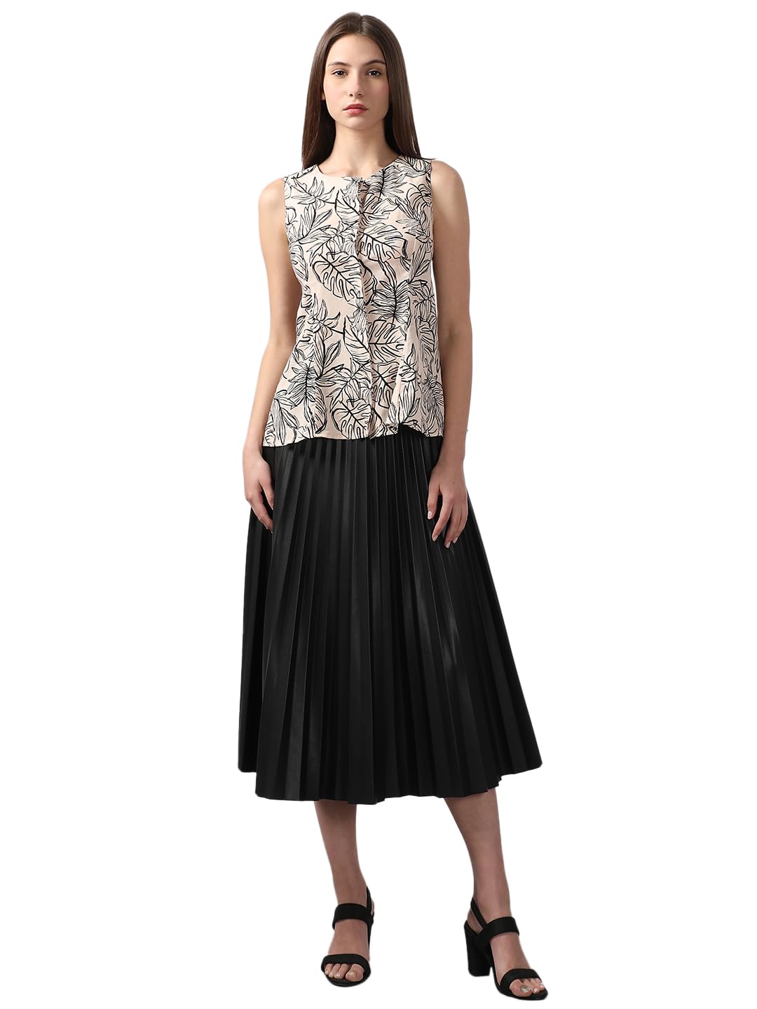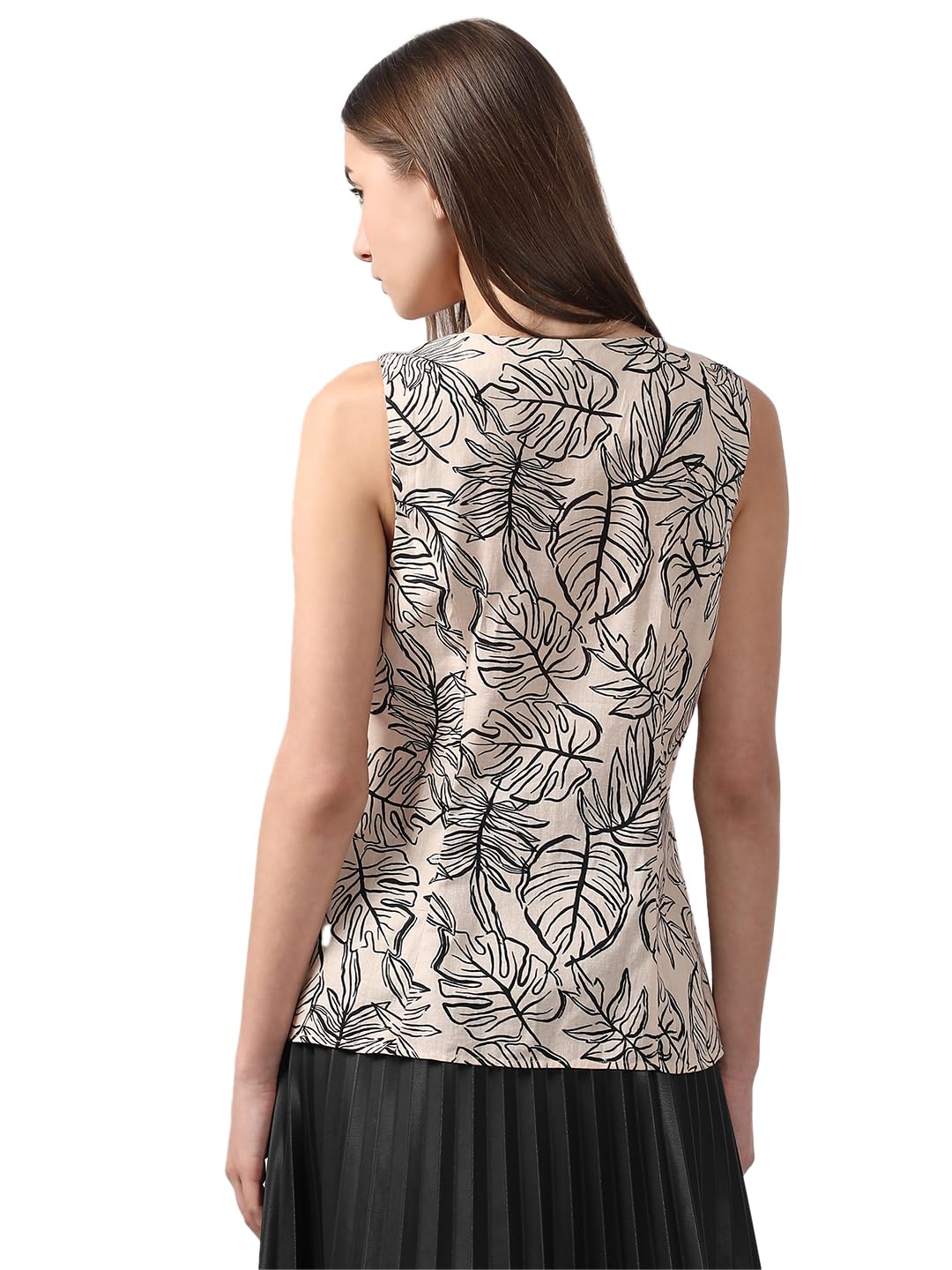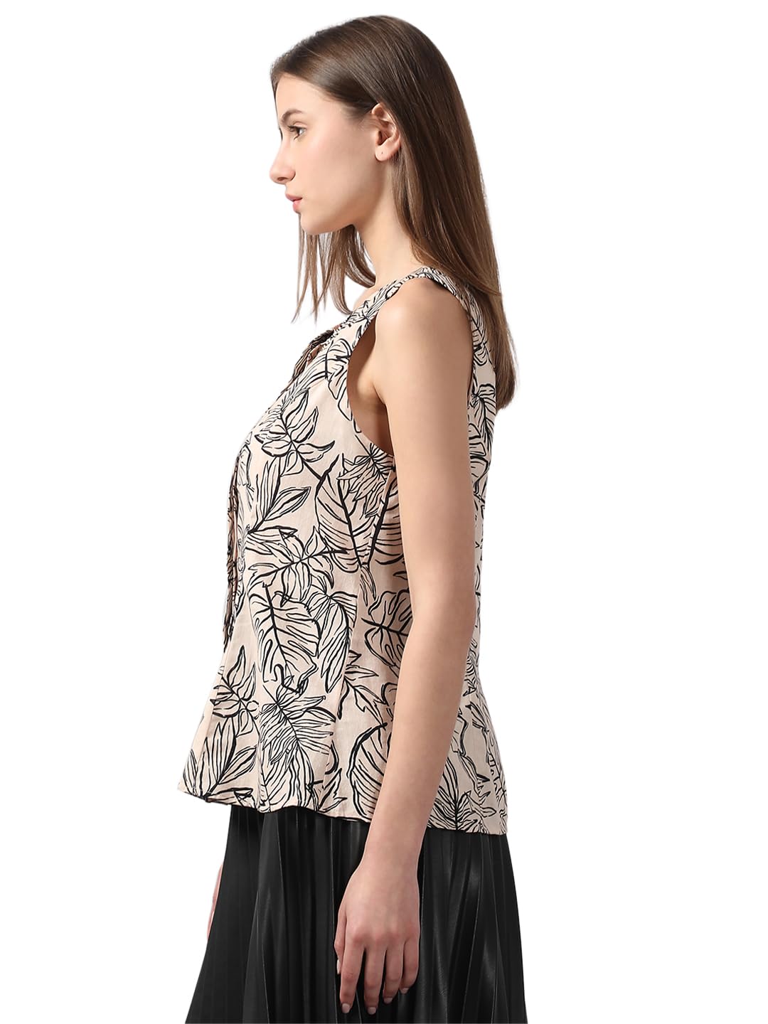 A sleek, sleeveless beige top featuring an all-over print for a touch of elegance. The front placket adds a refined detail, making it perfect for both casual and dressed-up occasions.