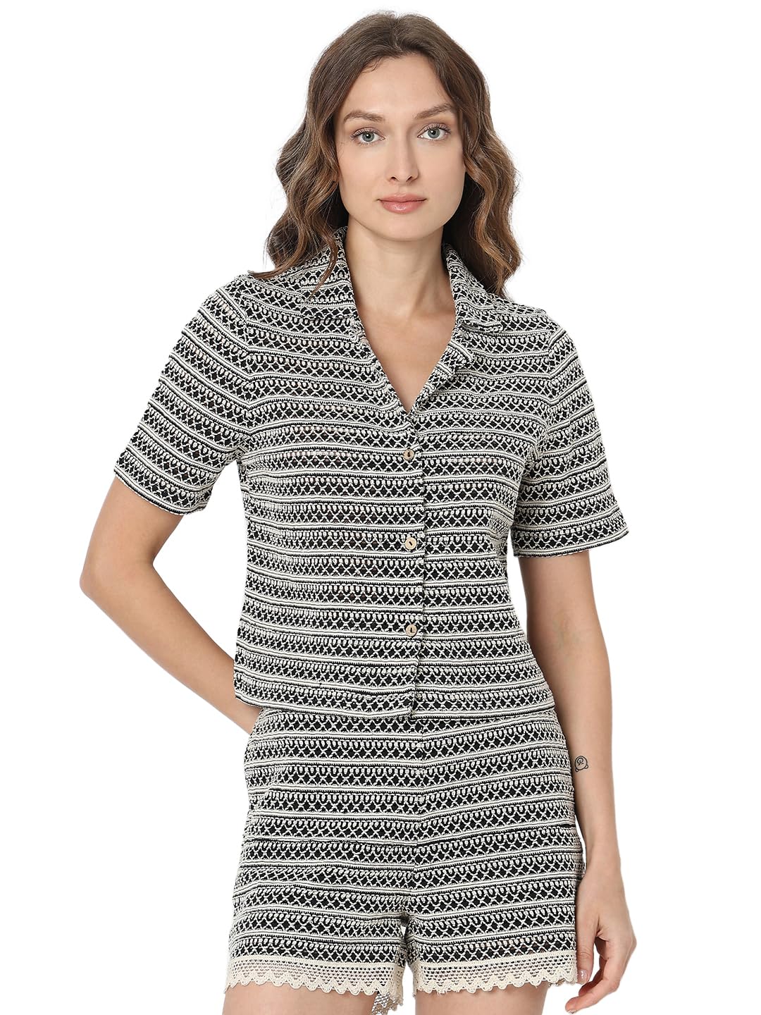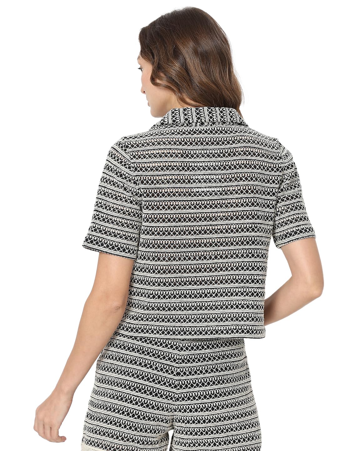 Introducing our chic black & white textured fabric shirt! This stylish piece features a resort collar, a trendy front placket with buttons, and comfy short sleeves. With a waist-length cut and a regular fit, it’s your go-to for effortless stylish. Style Note: Pair it with your favourite denim for an easy-breezy, laid-back look.