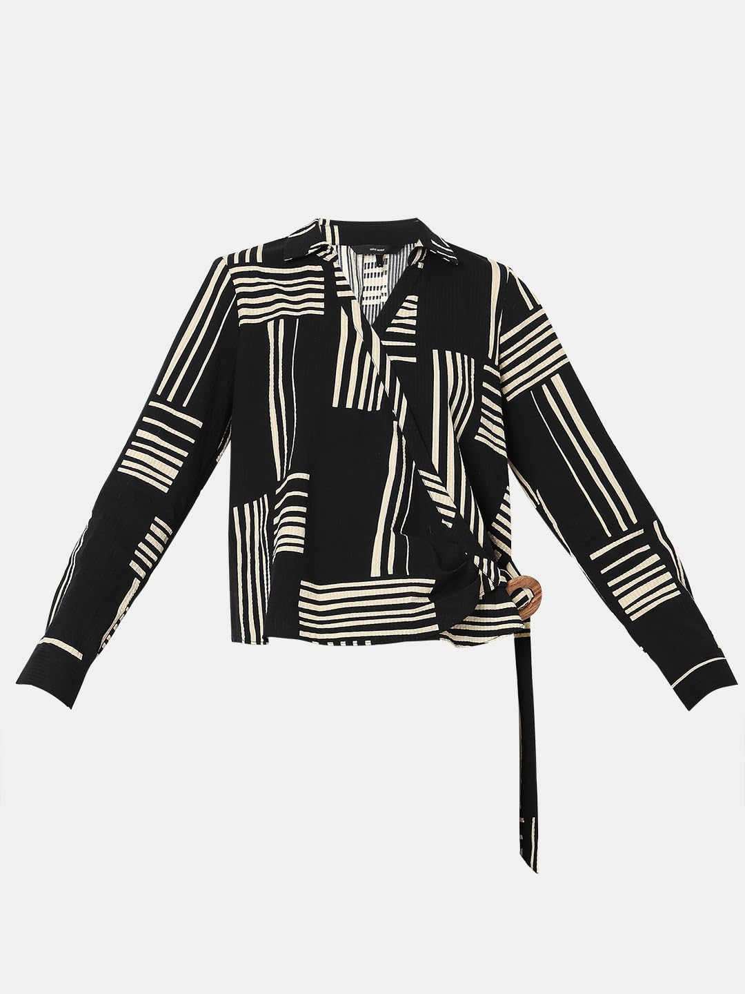 Black and beige printed front wrap top designed with wooden button trim as side and 3/4th sleeves. Offers a regular fit, and length falls at hip. Pair it with our matching pants and brown heels for a chic look.