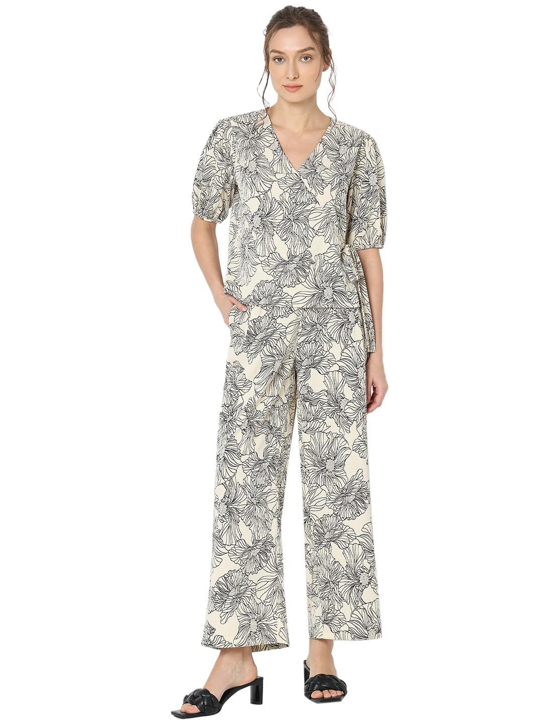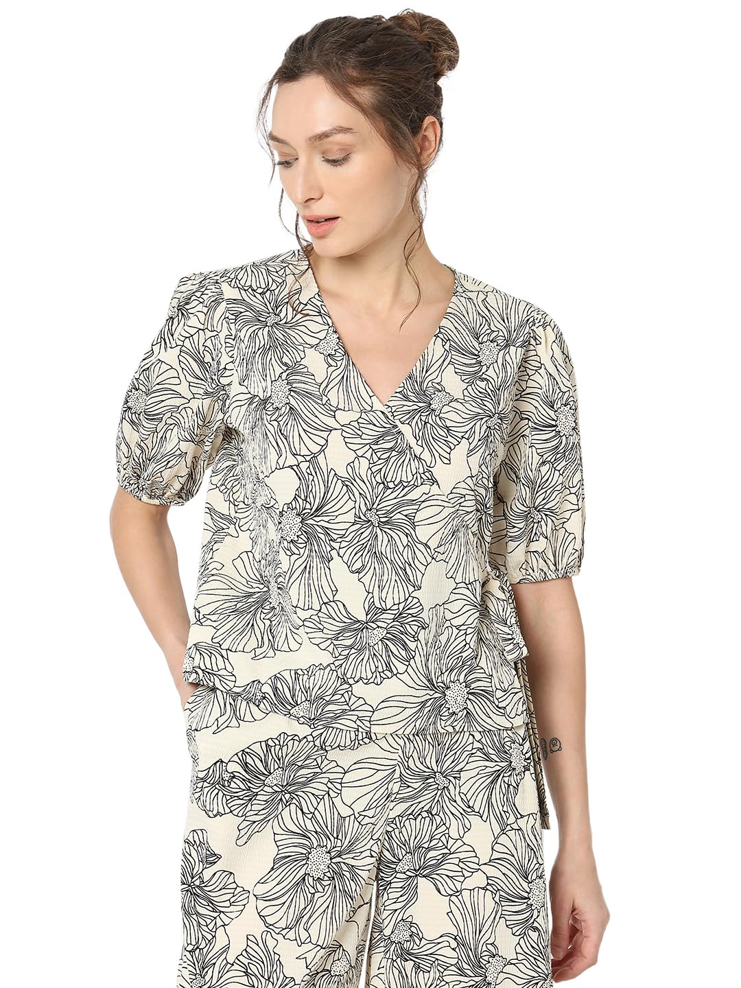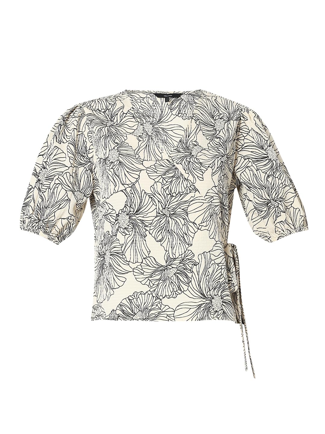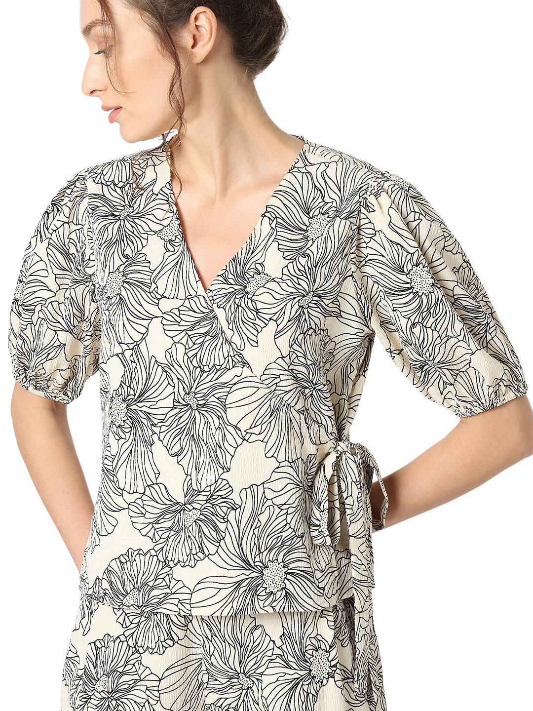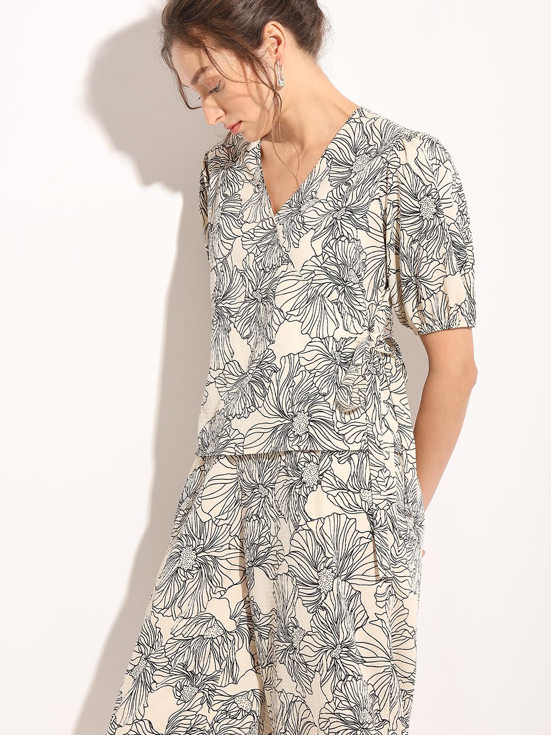 A timeless blend of sophistication and comfort. This chic short-sleeved top boasts an all-over floral print in classic black on beige, adding a touch of understated charm to your wardrobe. The seersucker fabric not only ensures a lightweight feel but also brings a subtle texture that elevates the overall look. Designed with a flattering mock wrap styling, this top effortlessly falls at the hips, offering a versatile silhouette that complements any figure. The stylish fusion of black on beige creates a subtle contrast, making it perfect for both casual and semi-formal occasions. Embrace the carefree spirit of summer with this versatile piece. Pair it with your favourite denim or a tailored skirt for a look that effortlessly transitions from day to night.